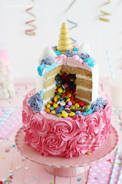Como habéis podido ver además esta tarta unicornio es una piñata, así sorprenderá mucho más a cortarla, a los niños les encanta, no sólo es llamativa por fuera, además sorprende por dentro y el bizcocho... de chocolate blanco... es el más valorado por familia y amigos y no es es de extrañar, es delicioso.