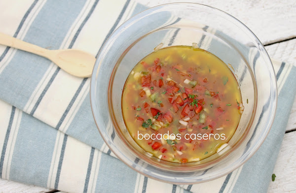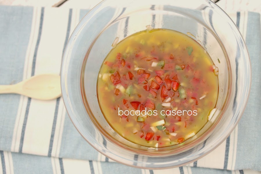 Hoy os voy a enseñar a hacer una vinagreta clásica, la que suelo hacer en casa habitualmente aunque tiene multitud de variantes, podemos poner o quitar ingredientes según nos convenga, hay quien no añade tomates y otros que añaden huevo cocido, pimienta, mostaza de Dijon, o miel, especias, hierbas aromáticas, en esta ocasión, he hecho la clásica pero con tomate, ideal para acompañar unos mejillones a la vinagreta.