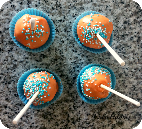 Yo los he adornado con unas bolitas blancas y azules, y se las tengo que echar antes de que se seque el chocolate, si no, no se pegarían.