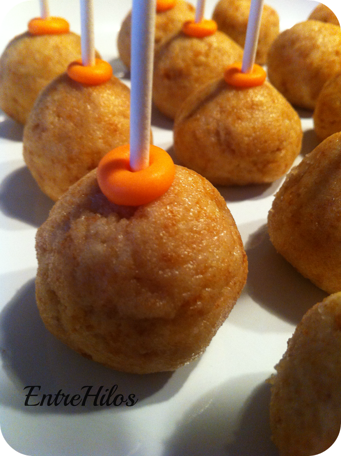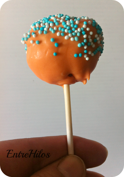 Ahora, cogemos un palito, mojamos un extremo en el Candy Melts y lo pinchamos en una de nuestras bolas, como si fuera un chupachups. Repetimos esta operación con cada bolita. Hay que tener cuidado de no atravesar la bolita, pero tampoco meterlo tan poquito que luego se nos caiga.