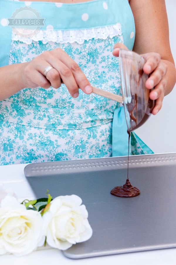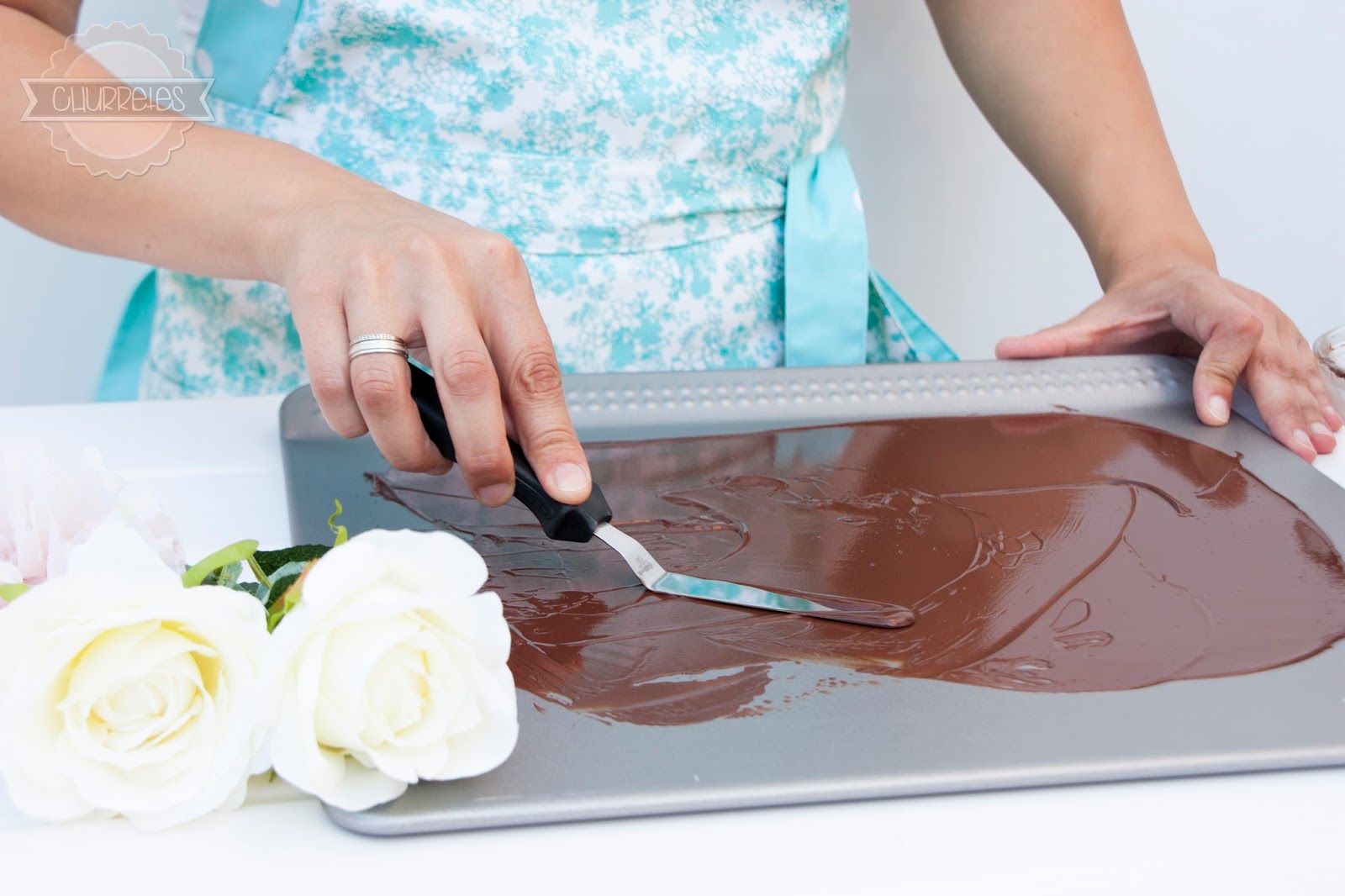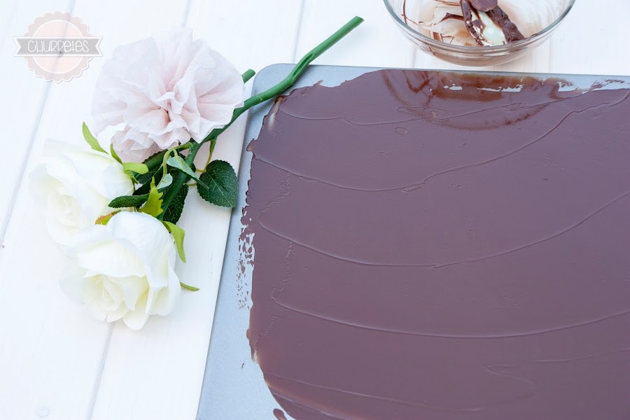 4. Extender el cocholate- con ayuda de una espátula extender el cocholate sobre la bandeja hasta conseguir una capa lo más fina posible, aplícate que de esto depende el resultado.