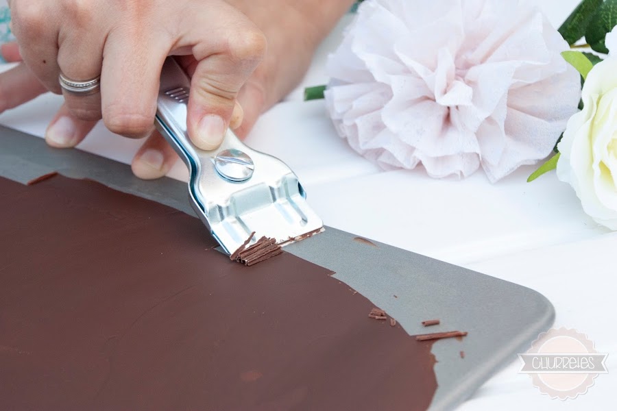 7. Sacar del frigorífico- deslizar una cuchilla o una espátula (yo he usado un rascavidrios) sobre la superficie de la bandeja metálica para obtener nuestras virutas. Ten en cuenta que si usas un rascavidrios y la cuchilla es muy nueva puede quedarse un poco atascada y arañar la superficie de la bandeja. También puedes utilizar una espátula de las que usan los pintores... ¡nueva claro!