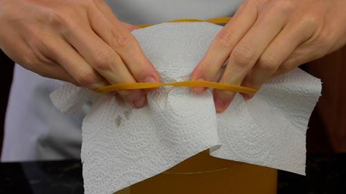 3. Cubre el bote de cristal con una gasa limpia o una servilleta de cocina y una goma.