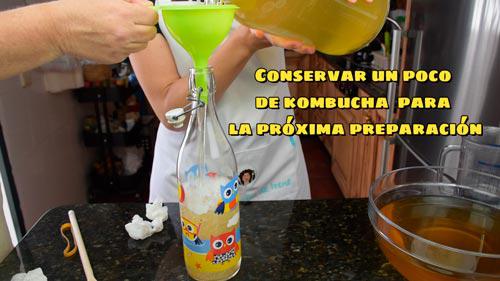 Una vez que ha pasado el tiempo de fermentación, has probado la kombucha y tiene el sabor que más te gusta, hay que pasar a embotellarla.1. Coloca un embudo en la boca de una botella de cristal que tenga cierre hermético. Vierte la kombucha poco a poco, dejando una tercera parte dentro del recipiente de fermentación para poder elaborar tu próxima kombucha. Este poco de kombucha te servirá como iniciador para la próxima tanda que vayas a preparar.
