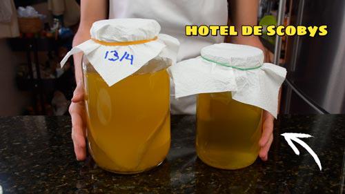 Un hotel de SCOBY es un contenedor que tiene múltiples capas de SCOBY y una cantidad suficiente de líquido de kombucha endulzado para mantener los cultivos vivos y activos. Los aficionados a la kombucha pueden mantener un hotel de SCOBY en su hogar como una forma de asegurarse de tener cultivos saludables y activos para hacer su kombucha casero.