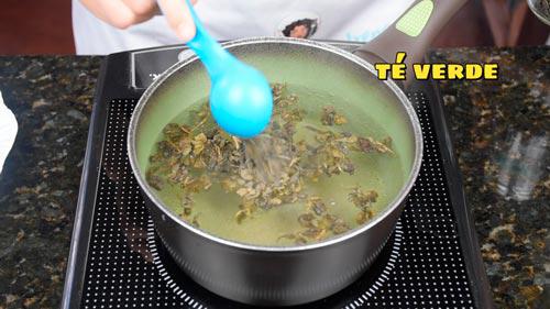 2. Antes de que comience a hervir, apartar del fuego y verter las dos cucharadas de té verde. Mezclar e infusionar unos 15 o 20 minutos.