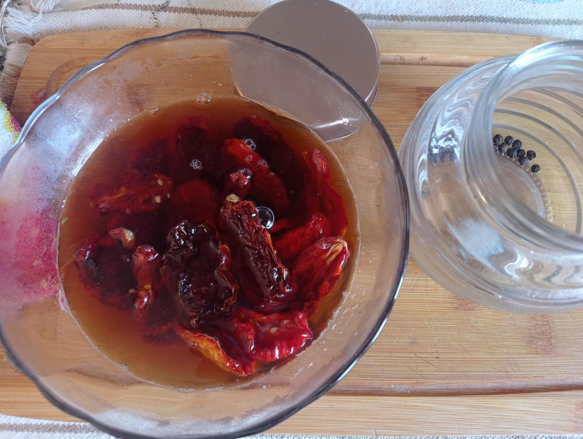 Forma rápida: en microondas: Poner en un recipiente apto para microondas una taza de tomates secos y una de agua, (yo le agrego una cuchara de azúcar y una de aceto )y lllevar al microondas 2 o 3 minutos.