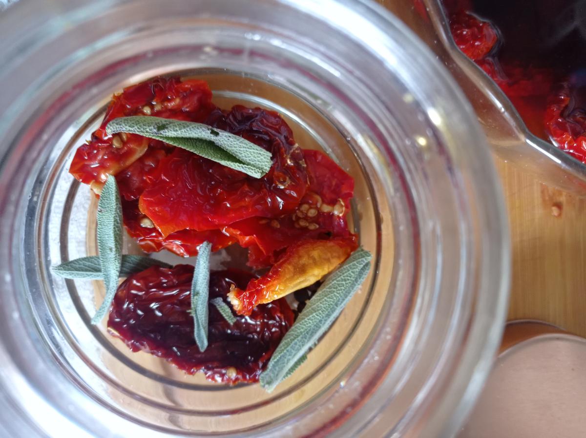 Colocar los tomates que hemos hidratado en un recipiente de vidrio , lo haremos por capas, primero cubrimos la superficie .Cubrimos con un poco de aceite de oliva y granos de pimienta negra, le agregue hojas de sabia, puede ser romero, oregano , ajo ,lo que prefieras.