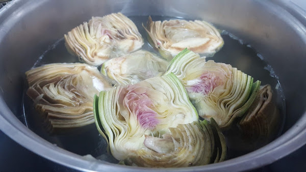 Si las dejamos enteras, escurriremos el limón dentro de un bol con agua, e iremos metiendo las alcachofa en el bol mientras limpio el resto. Pero si las cortamos, entonces untaremos de limón cada una de los trozos de la alcachofa, mientras limpiamos las demás.