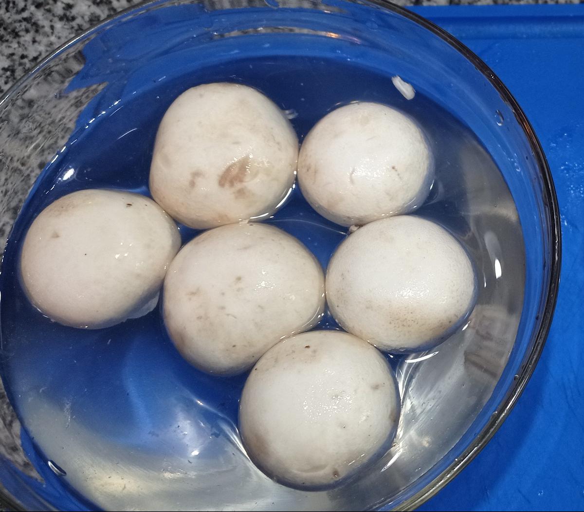 Colocar agua en un bol, con unas gotas de vinagre, introducir los champiñones y frotar con las manos para quitar la suciedadAl retirarlos veremos las impurezas que quedaron en el agua.