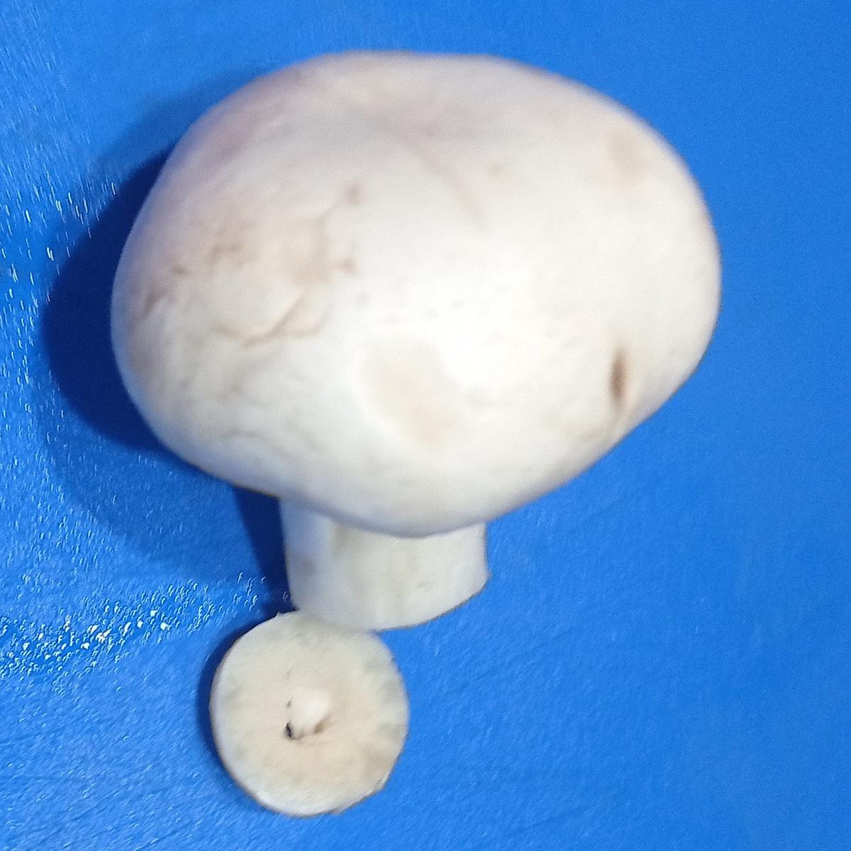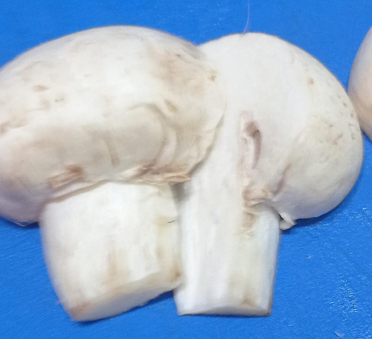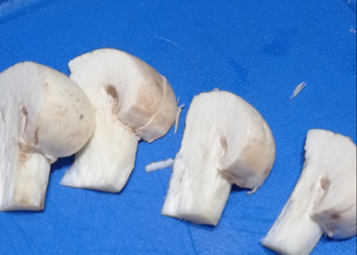 Cortamos el champiñón en diagonal , por la mitad y luego volvemos a cortar esa mitad en diagonal, siempre el corte es en diagonal , no recto.