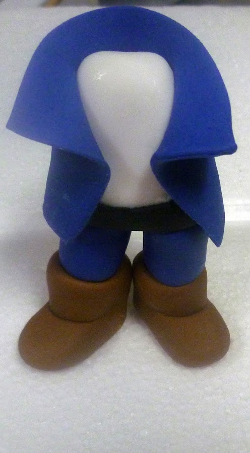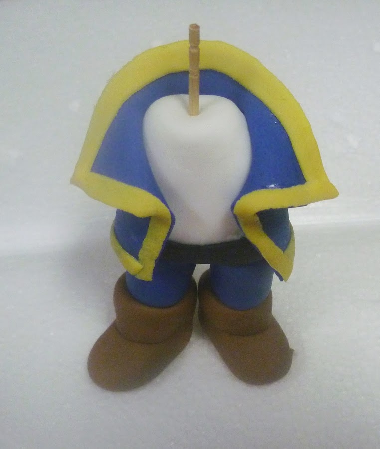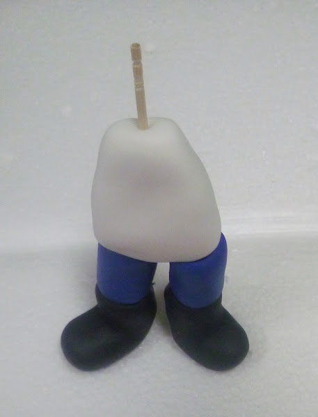 y pincelamos con pegamento comestible (agua con CMC) , la parte superior de las botas ,insertamos las piernas y dejamos secar hasta que endurezca para que resista el peso del torso y la cabeza sin deformarse , podriamos dejarlo unas horas o toda la noche eto depende del tamaño del que estemos modelando este personaje .