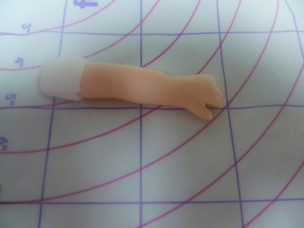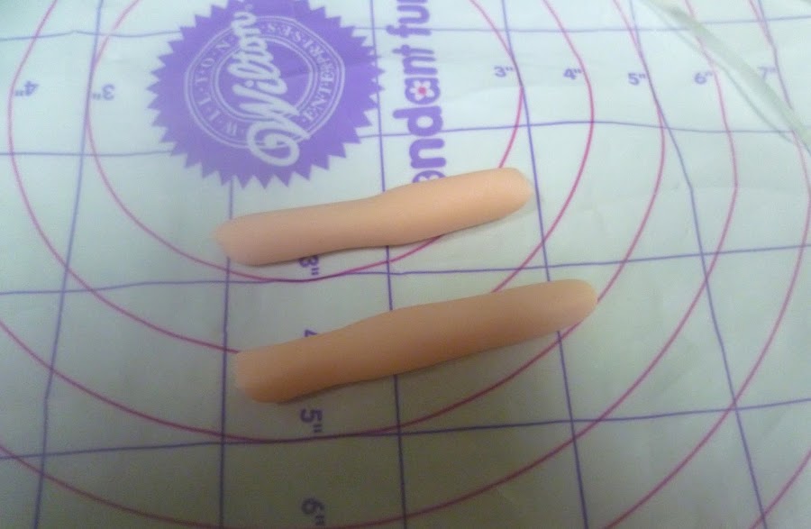 Es el turno de los brazos empezamos con dos rollitos de pasta de goma de color piel y afinamos a la altura del codo y la muñeca , aplanamos ligeramente la zona de la mano , estiramos pasta en color blanco para hacer las mangas de la camisa de Jake