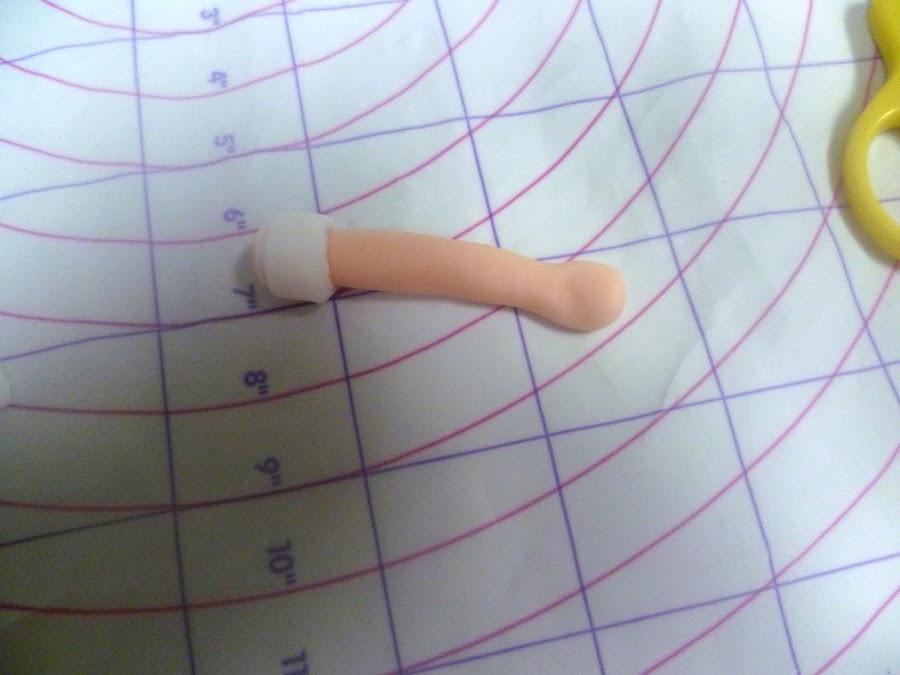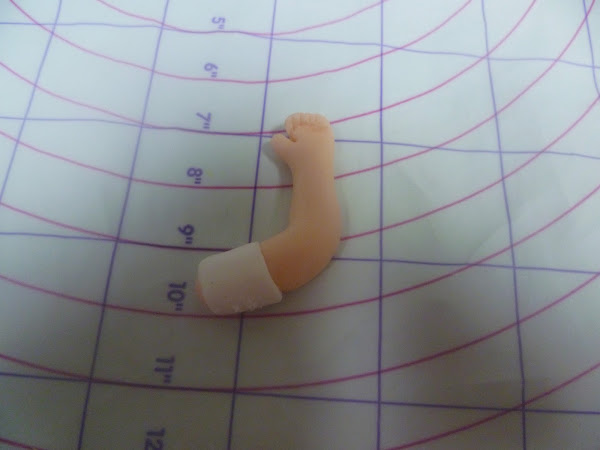 Ahora curvamos los brazos para darles la posición deseada y dejamos secar , estos los pegaremos usando glasé real y apoyaremos sobre un palillo con una bolita de masa o tecnopor en el extremo y clavado en la base de tecnopor sobre la que estamos trabajando este modelado , este paso es para evitar que el brazo se deslice antesde quedar completamente seco el glasé