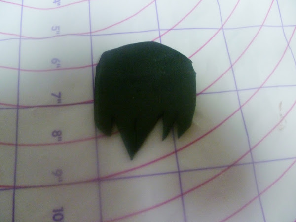y para el cabello con pasta de goma sin ajustar de color negro y una eteca daremos forma al cabello , el que pegaremos de atras hacia adelante , levantando las puntas para imitar el singular peinado de Jake . No olvidemos hacerle orejas , Ya tenemo lista la cabeza para insertarla en el torso debemos tener cuidado que el palillo no sobresalga de la cabeza y aplicar un punto de glase real para pegar la cabeza , otro detalle es que antes de colocarla , para hacer el cuello V de la camisa de Jake con un triangulo de masa color piel , y colocar una bolita de color piel sobre esta para formar el cuello .