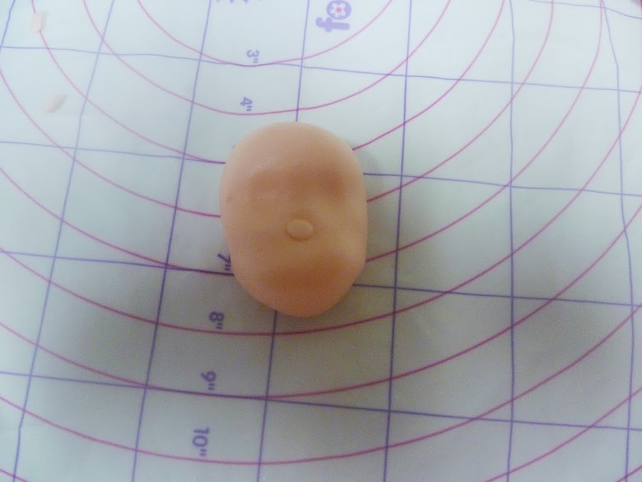 Ahora empezrenos a modelar la cabeza , iniciamos con una esfera y afinaremos a la mitad para formar la frente , con un stick de bolita o un bolillo marcaremos ligeramente el lugar a colocar los ojos, haremos una bolita para la nariz.