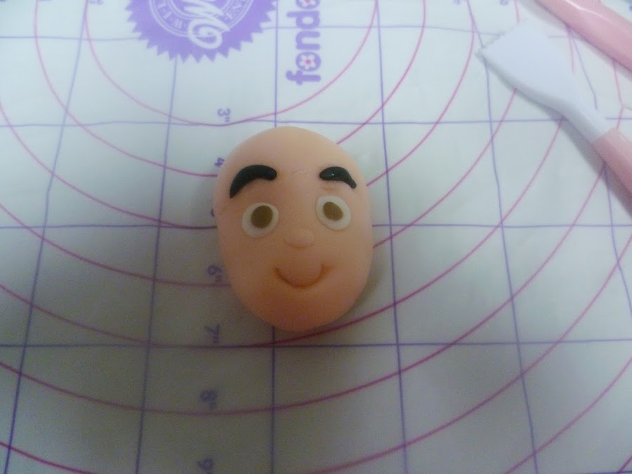 Segiremos agregando detalles , como dos rollitos curvos para las cejas y las pupilas de color marrón, luego una tira de pasta de goma o fondant roja para simular el pañuelo