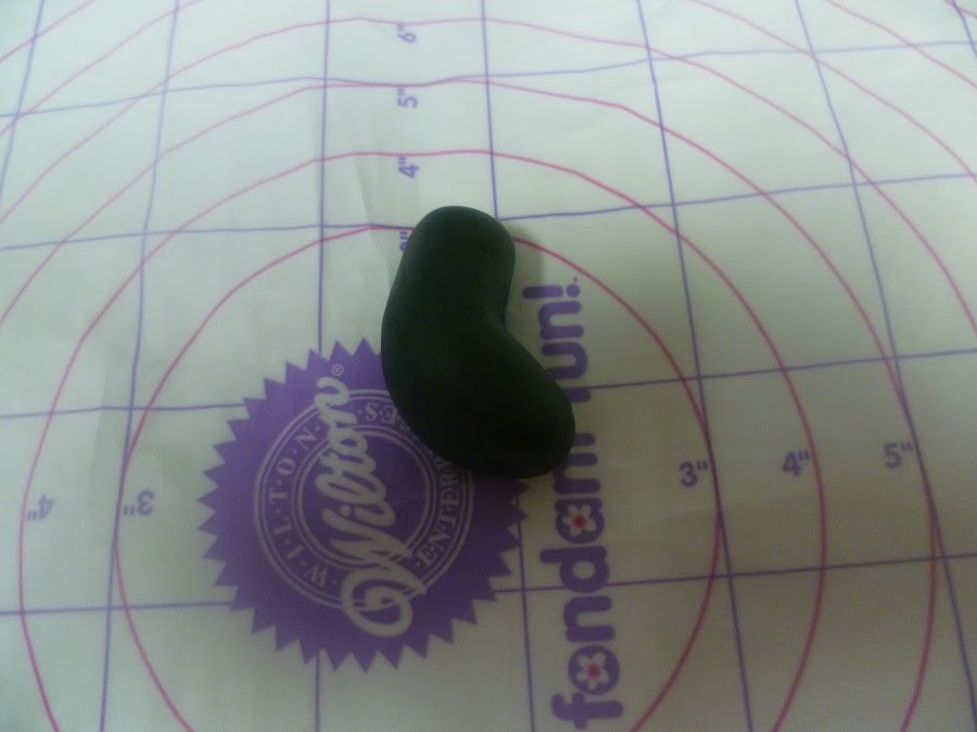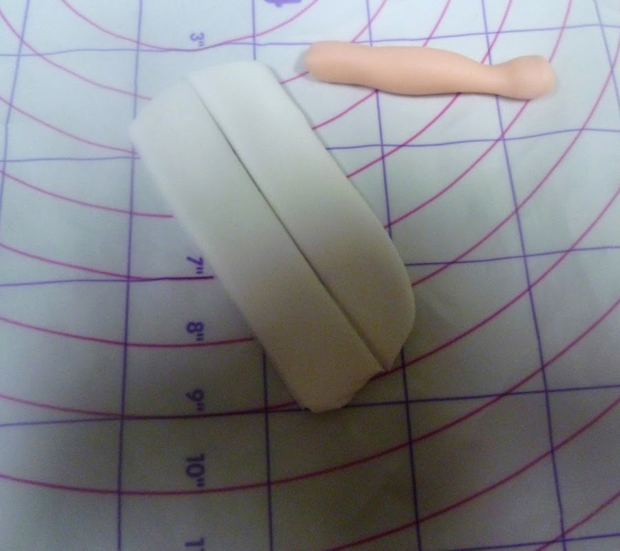 Haremos una pera de color blanco con la pasta de goma y la aplanaremos un poco porque Jake es delgado no quemeo una figura muy voluminosa , la pegamos a las piernas colocando un poquito de pegamento comestible e insertandolo en los palillos que sobresalían de las piernas ,también insertaremos un palillo para luego unir la cabeza al torso y pegaremos una tira de pasta de goma negra a modo de cinturón
