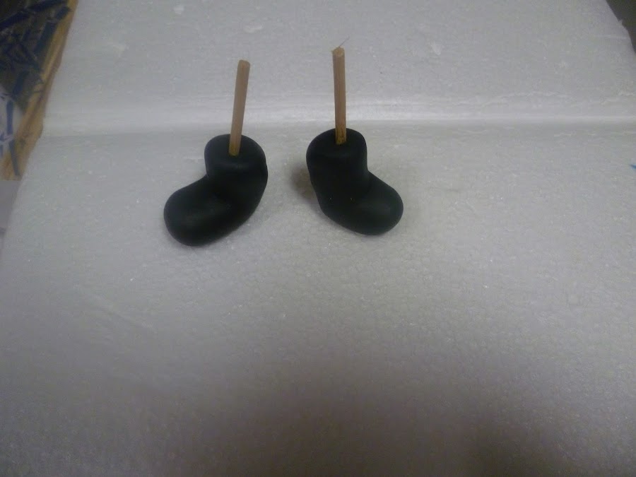 Estas botas las vamos a colocar sobre una base de tecnopor y les atravesaremos 2 palillos de modo que después estos nos sirvan para clavar el muñequito en la torta y para sostener las piernas ,