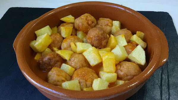 Para servir, coloca las albóndigas en una cazuela de barro o una bandeja y encima le repartes las patatas fritas. Y ahora sólo queda prepararte para triunfar!!!