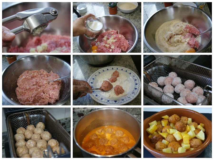 Coloca harina en un plato y con la ayuda de dos cucharas o con las manos, forma bolitas de masa a tu gusto. Pásalas por la harina y dales forma redonda con las manos. Fríe las albóndigas en abundante aceite a temperatura media. Yo suelo hacerlo en freidora y sirvo raciones de 5 albóndigas por persona. Cuando se doren, pasamos a terminar el plato con la salsa de tomate.