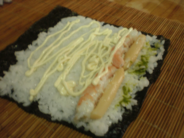 Poner una lámina de nori (alga) con el lado brillante hacia abajo sobre una esterilla para sushi, en sentido horizontal, y con las manos humedecidas coger porciones de arroz y extender una capa uniforme sobre el nori dejando un margen de 2 cmts. en el extremo más alejado.