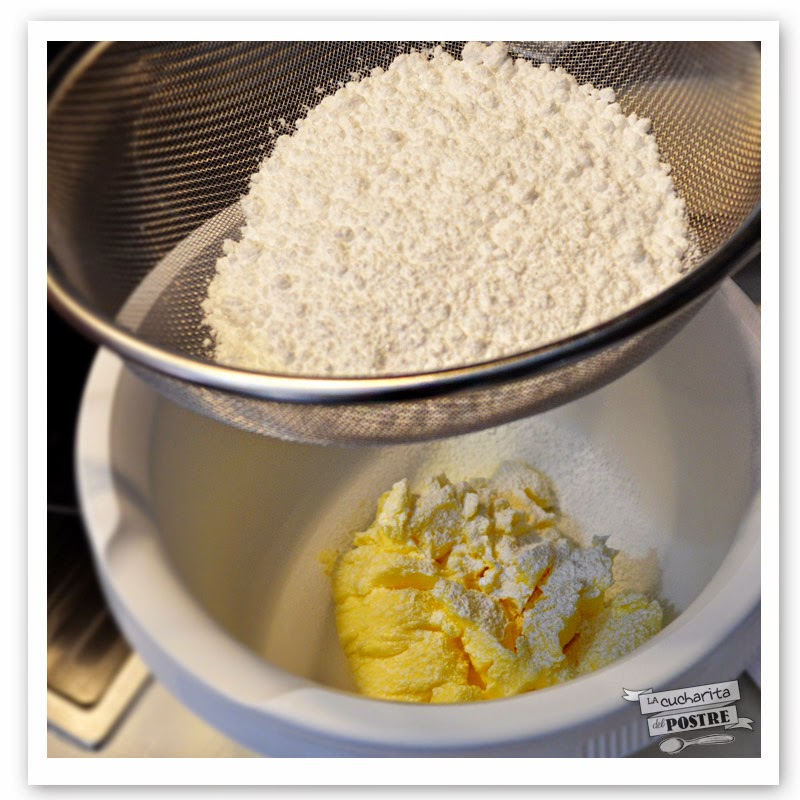 5. Mientras se enfría la crema, pon en un bol la mantequilla sin sal a temperatura ambiente y tamiza sobre ella el azúcar glasé.