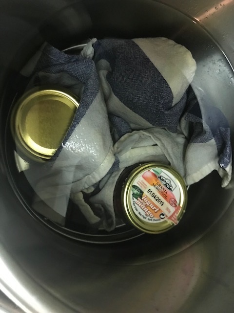 Dejamos enfriar y cerramos los tarros y los pasteurizamos en una olla con agua hirviendo durante 15 minutos, los botes deben quedar totalmente cubiertos de agua durante todo el proceso, pon un trapo entre los tarros para que no se golpeen.