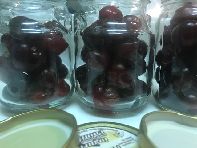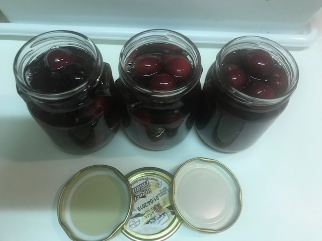 Ponemos las cerezas en los tarros y las cubrimos con el almíbar caliente, llenando hasta medio centímetro del borde.