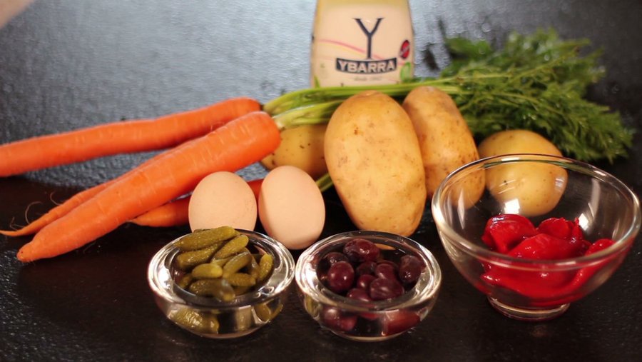 Existen versiones variadas de ensaladilla rusa dependiendo de si se agregan o no ciertos ingredientes, pero parece que la patata y la zanahoria no faltan en casi ninguna. Nosotros te mostramos nuestra versión, donde incluimos esas dos hortalizas, pero también pepinillos, pimiento rojo en conserva, aceitunas negras, huevo cocido y Ligeroliva Ybarra, una salsa más ligera que la mayonesa convencional (50% menos calorías) y que usaremos de la misma forma para ligar los ingredientes.