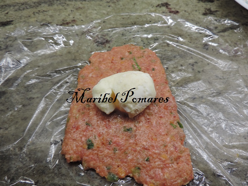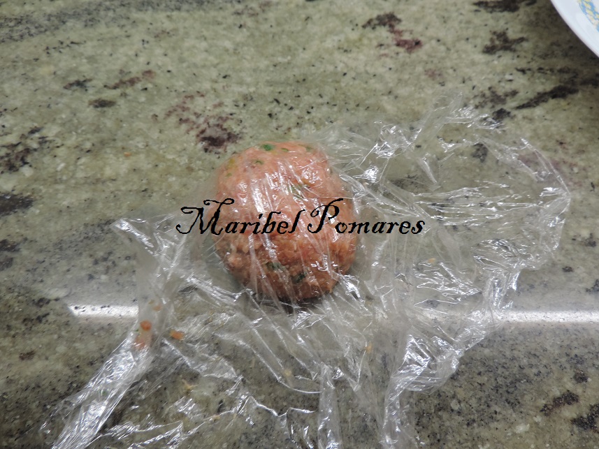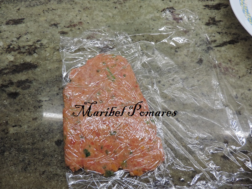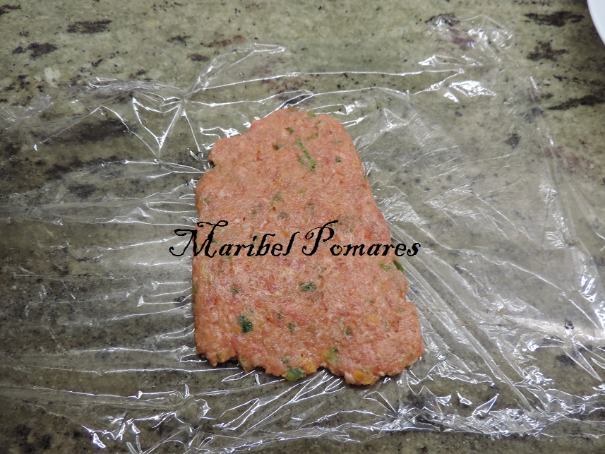 Ponemos unos 80 grs de la mezcla de carne encima de un poco de papel transparente.