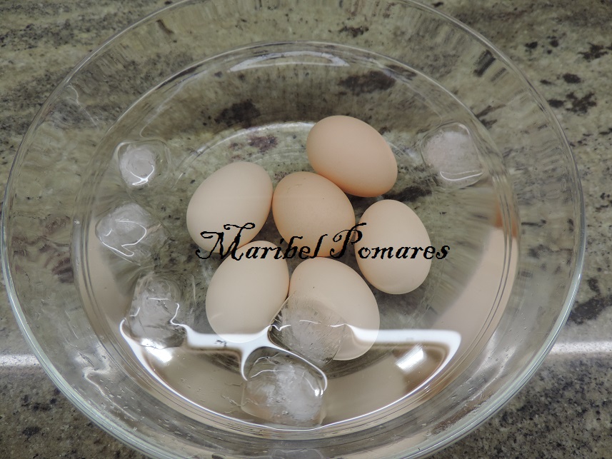 Los pelamos y reservamos, cuesta un poco, porque los huevos están blandos y hay que tener cuidado que no se rompa la yema.