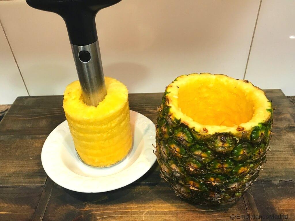 Empezamos cortando la piña. Yo uso un cortapiña ya que así es más fácil y saca las rodajas perfectas.