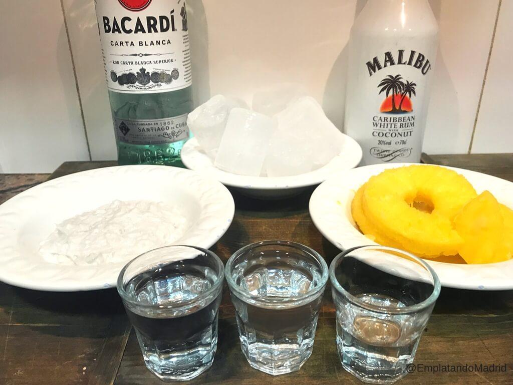 Prepara las medidas del ron. Yo vario un poco la receta sustituyendo una medida de ron por una medida de Malibu, un ron de con coco que nos dará un toque de coco más acentuado en la piña colada.