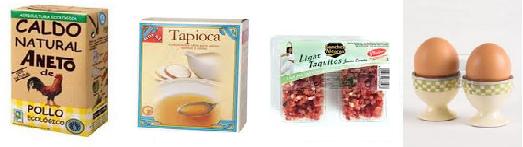 Ahora la sopa: 2 bricks caldo de pollo, tapioca, taquitos de jamón serrano y 2 huevos.