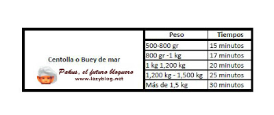De modo similar a cuando os contamos cómo cocer bien un buey de mar, la técnica para cocer una centolla es muy fácil, si seguís nuestras indicaciones. Ponemos una cacerola grande con agua, dos hojas de laurel y sal (20-40 g por litro de agua) y metemos la centolla a cocer, arrancando desde agua fría. Dejamos que el agua alcance la temperatura de ebullición y bajamos el fuego, dejando que la centolla cueza en función de su peso, según la tabla siguiente.