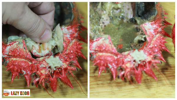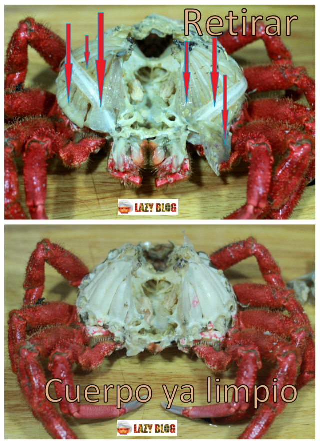 Lo primero que hay que hacer es retirar todas las branquias y filtros de la centolla, hasta llegar a su caparazón interior, que es blanco brillante. Todo lo que quitamos es para tirar.