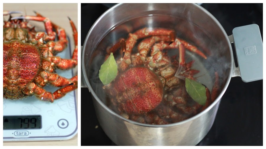 La mía pesaba 800 g por lo que la tuve cociendo 17 minutos desde que el agua empezó a hervir. Una vez cocida, sacamos la centolla del agua y la enfriamos metiéndola en otra cazuela con agua fría y unos hielos para cortar la cocción y que no se cueza de más. Así queda la carne perfecta y sabrosa lista para sacarle partido según las dos posibilidades que os indico ahora,