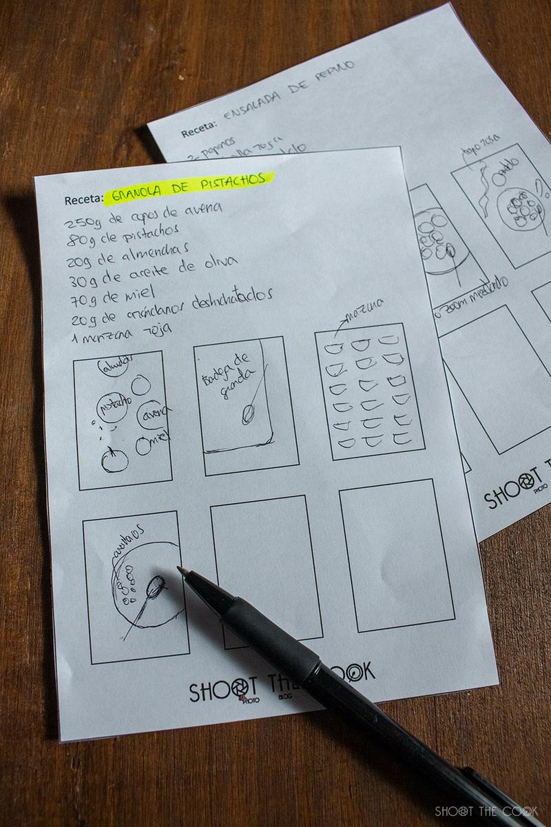 Aparcamos la cocina y nos ponemos con el tema fotográfico. Lo primero que hago es dibujar unos bocetos de las fotos que quiero sacar a la receta. Cada una es un mundo y su presentación necesita de un cuidado exclusivo. Por ello pongo especial atención en los atrezos y colores que más van a favorecer al plato, que tipo de luz será la más conveniente y que perfil el más favorable. Todo este proceso previo termina ahorrándome mucho tiempo a la hora de la verdadera foto.