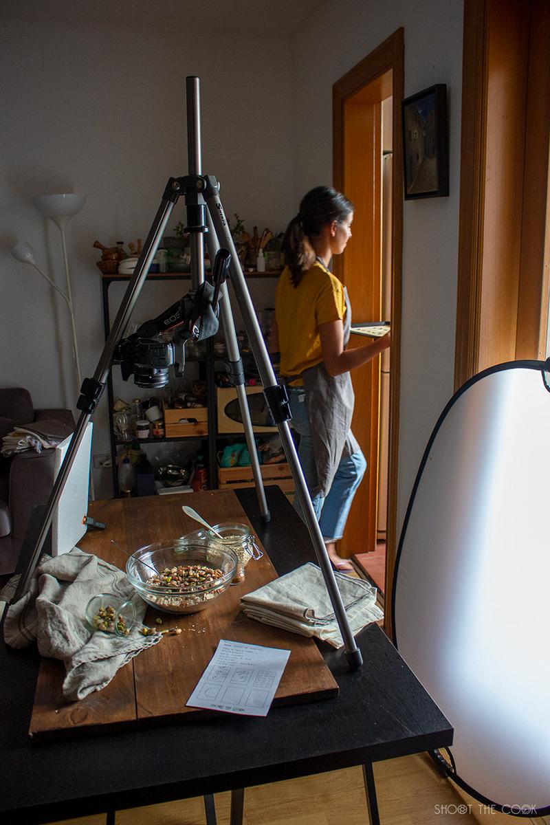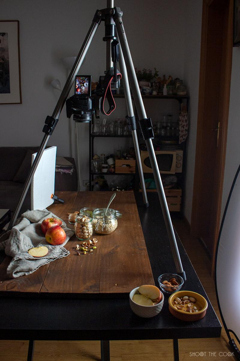 Ahora sí, ya estoy lista para cocinar la receta definitiva y fotografiarla. Antes de meterme en la cocina dejo montado parte del escenario. Coloco el fondo, el trípode, la cámara y selecciono algunos platos y atrezos que tenía previstos. Con esto listo, me pongo el delantal y a cocinar.