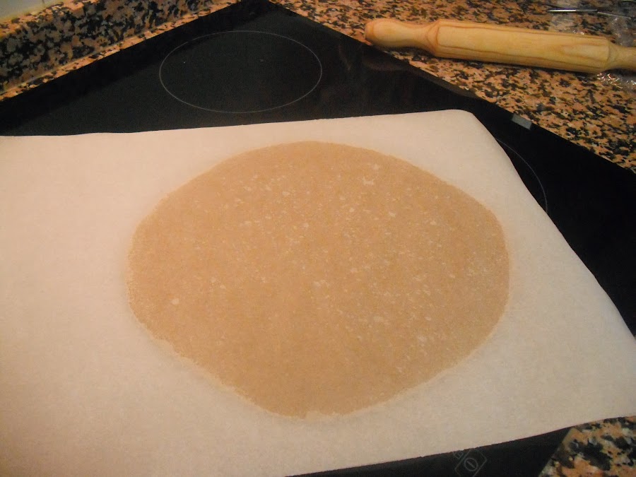 5. Precalentamos el horno a 180ºC función arriba y abajo. Sobre la mesa que vayas a trabajar pon papel de hornear. Ahora os explico mi método para estirar la masa, que no es nada del otro mundo pero a mi me funciona bien. Coge una porción de masa y un trozo de papel de hornear, pliégalo por la mitad. En la zona donde has hecho el pliego pon la bolita de masa y comienza a amasarla con el rodillo. De esta forma evitamos que se pegue al rodillo, que se pegue a la encimera y que la masa pierda el frío de golpe. Tienes que estirarla hasta dejarla finita, del tamaño del grosor de una llave. Es decir unos 5 milímetros. Si las haces más gordas se hincharán mucho y quedarán crudas por dentro, además no serán crujientes.