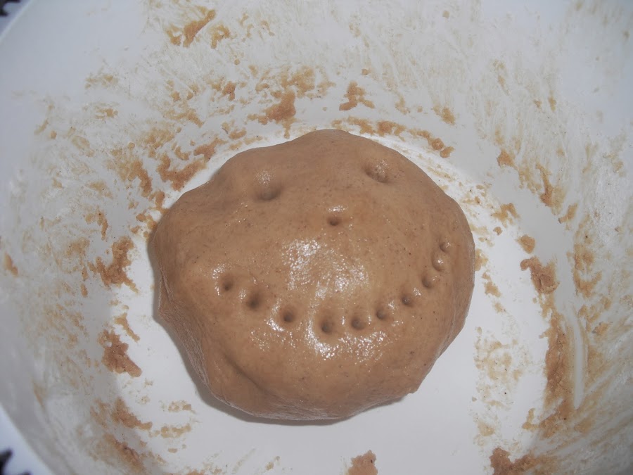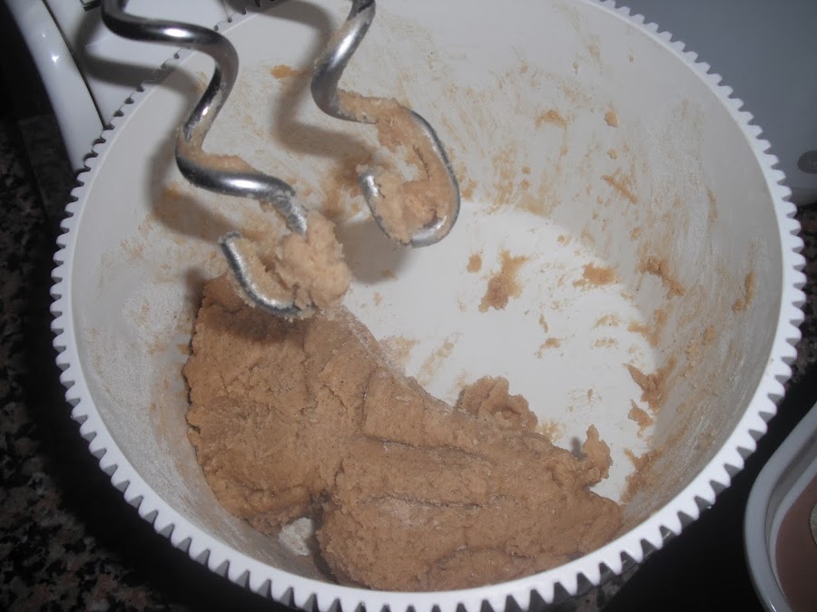 3. Ahora toca poner la melaza, o miel de caña en el bol de la masa. Poco a poco y sin dejar de batir. Tiene que quedar como una mezcla oscura y un poco pegajosa. Cuando este todo bien homogeneizado vamos incorporando la mezcla de harina poco a poco cucharada a cucharada. Si usas batidora amasadora es el momento de cambiar a las varillas amasadoras. Si lo haces manualmente tienes que poner un puñado de harina en mesa y comenzar a trabajar la masa manualmente. Incorpora la harina poco a poco hasta que la masa sin dejar de estar brillante ya no esté tan pegajosa. Verás que olor tan rico tiene la masa "galletuna".