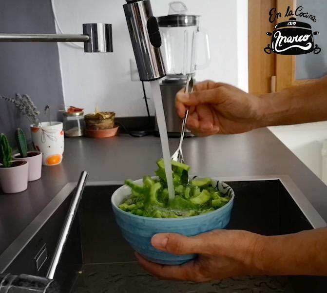 Después de una hora el vamos a lavar bajo el agua los trozos de melón amargo de manera que pierda toda la sal.