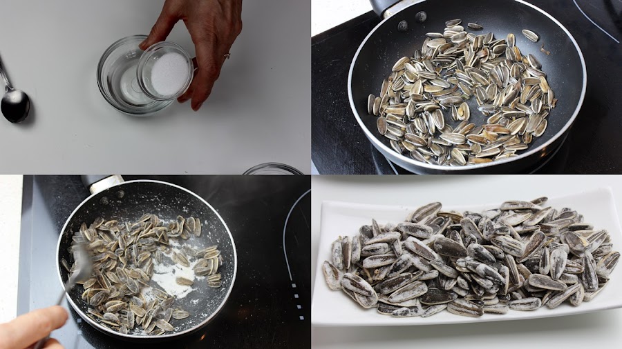 Ponemos el agua y la sal en un cuenco y la removemos hasta que se haya diluido la sal. Ponemos una sartén al fuego, añadimos el agua con la sal diluida y las pipas limpias. Las dejamos hervir dándoles vueltas continuamente hasta que se evapore el agua y quede solo la sal, más o menos unos 12-15 minutos dependiendo de la cantidad de pipas que queramos hacer, las probamos y si vemos que están tiernas y no crujen al partirlas las dejamos al fuego un poquito más.