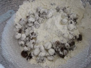 Escurrir las pasas y pasarlas por harina. Para que queden mejor las volcaremos sobre un colador y las sacudiremos para quitarles el exceso de harina.