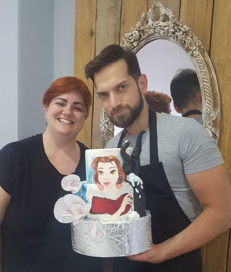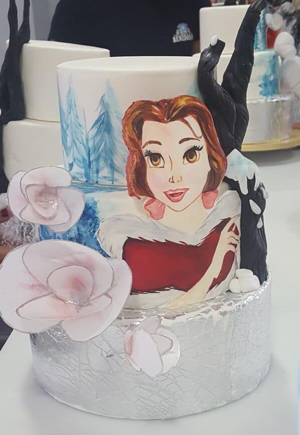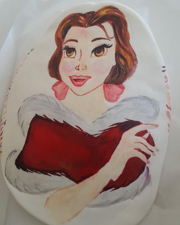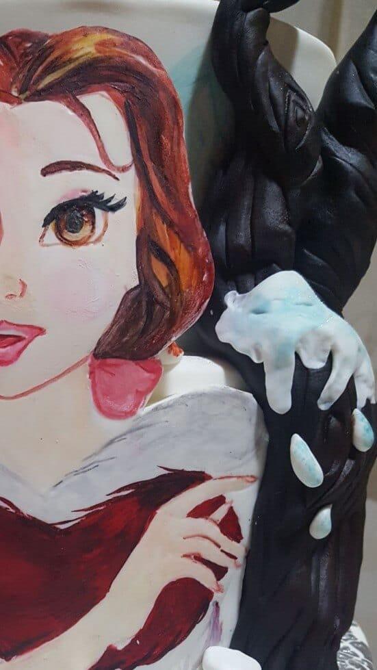 Ya con las bases forradas empezamos a montar la composición…y oh sorpresa no habíamos terminado de pintar noooo. Simulamos en la parte posterior de bella el pelo (pintado claro deeeee marrón jajaja) e hicimos un paisaje en la parte central de la tarta.