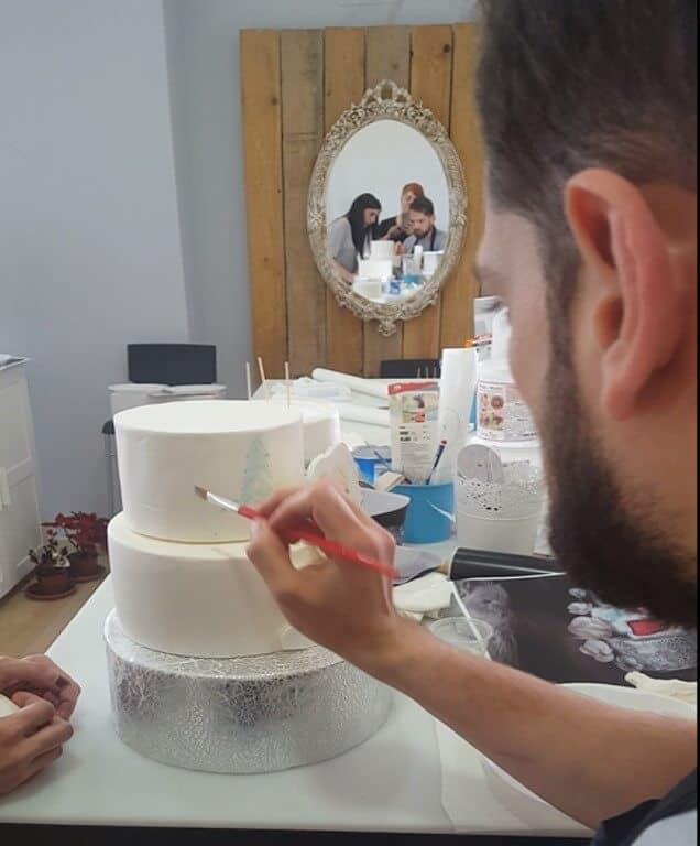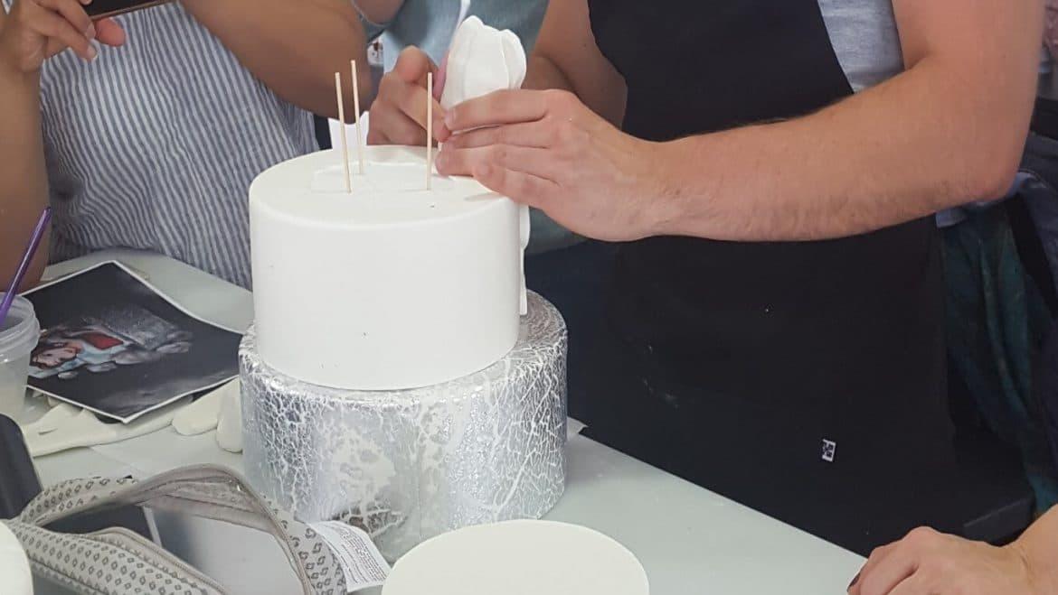 En el curso lo que hicimos fue añadir laminas de papel plata (ojo éstas no eran comestibles) encima del fondant… de nuevo estiramos para conseguir éste efecto.