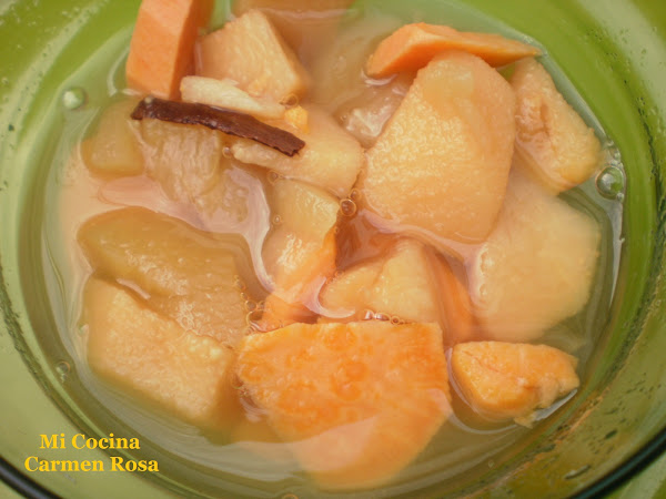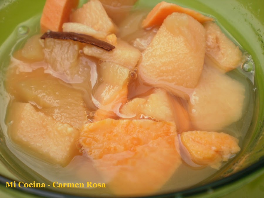 Gracias a mi suegra, mi querida y dulce Paquita (tengo la suerte de que se llama incluso como mi madre), me ha hecho recordar y disfrutar como en mi más lejana niñez cuando mi madre, en las húmedas y frías tardes de Otoño, preparaba grandes ollas de membrillo, castañas y batatas cocidas para merendar y en ocasiones, éste delicioso postre, una dulcísima compota de frutos otoñales.