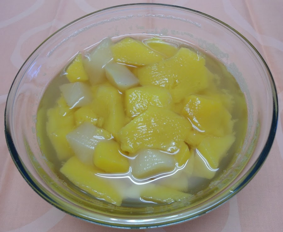 Las frutas se cortan en trozos y se ponen en una cacerola con un poco de agua, 2 cucharadas de azúcar y el palo de canela, se deja que todo se haga, se prueba y cuando este tierna (pero no desecha) se retira del fuego se deja enfriar y se mete en la nevera hasta la hora de servir.
