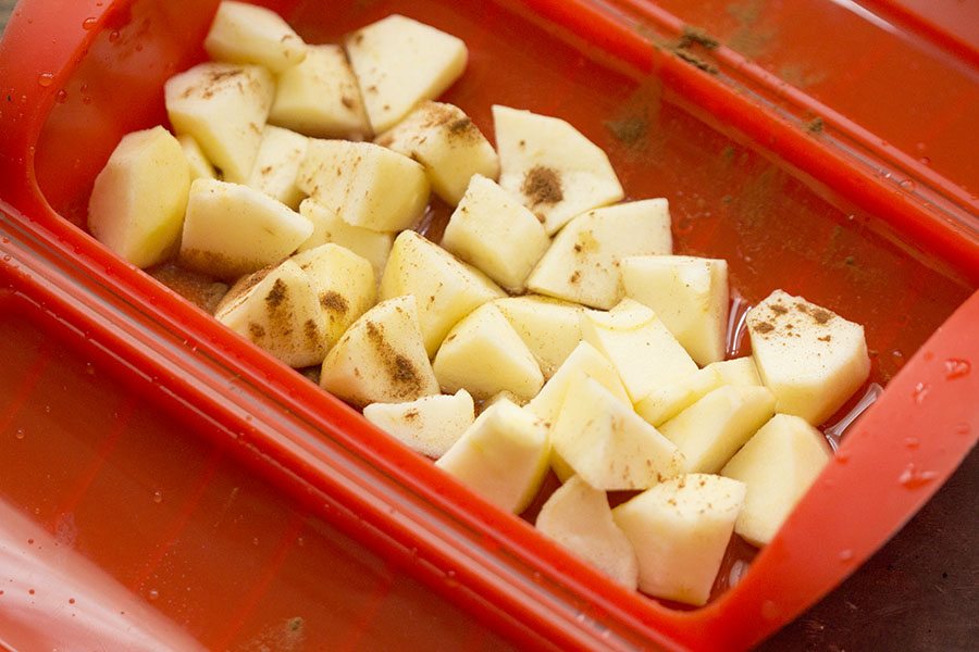 1. Pelamos y cortamos la manzana en dados y la colocamos en el estuche de Vapor junto a 50 ml. de agua y el zumo de limón. Ponemos en el microondas a máxima potencia 4 minutos (800W).